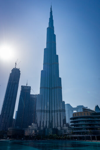Unten angelangt muss man den Kopf doch arg weit nach hinten neigen und die Kamera sehr schräg am Boden halten, um den Burj auch wirklich bis zur Spitze zu sehen. Hier zeigt sich die phänomenale Ingenieurs-, Architektur- und Bauleistung in voller Pracht. Während tagsüber die Fassade in der Sonne glänzt, erscheinen abends bei der Wassershow die Lichter der (ich weiß, ich wiederhole mich) größten LED-Leinwand der Welt.