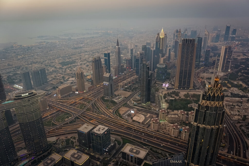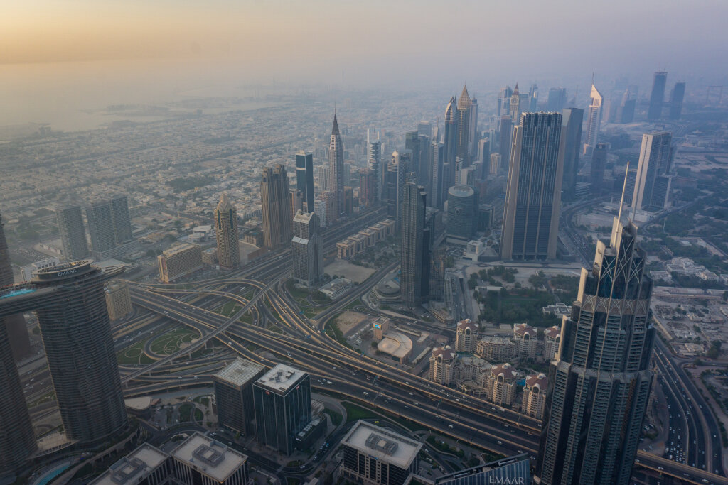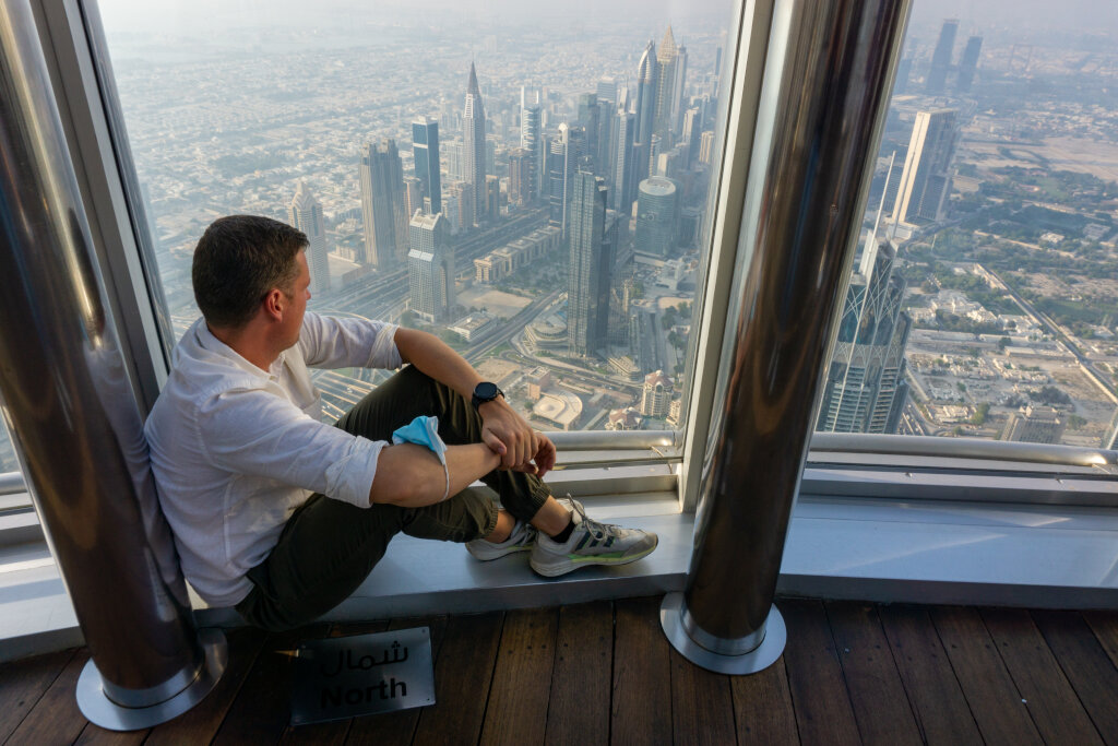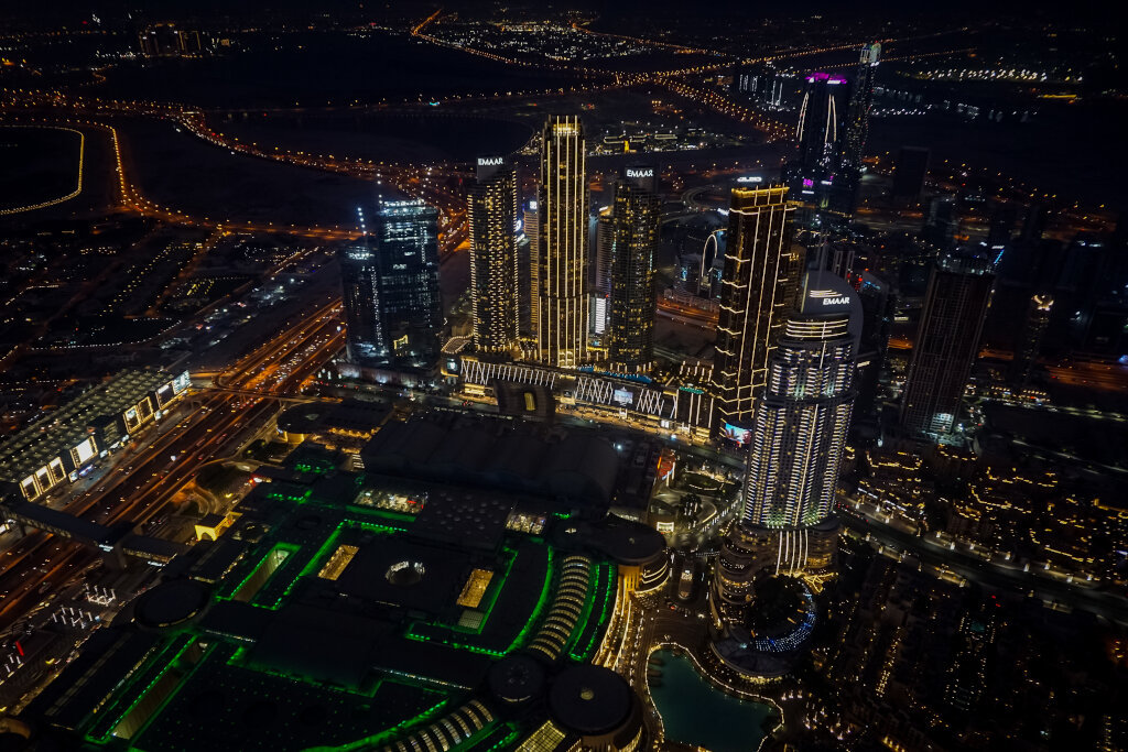 Beeindruckend ist der nächste Superlativ Dubais. Mit knapp 830 Metern steht dort bekanntlich das höchste Bauwerk der Welt: der Burj Khalifa. Wie könnte es anders sein, ist in ihm natürlich der weltweit schnellste Aufzug verbaut und wir stehen nach nur einer Minute schon im 124. Stock. Leider verschwindet viel der Stadt im sandigen Dunst, aber die Spitze des Burj al Arab und die angelegte Inselgruppe „The World“ können wir erspähen, bevor die Lichter der Stadt angehen.